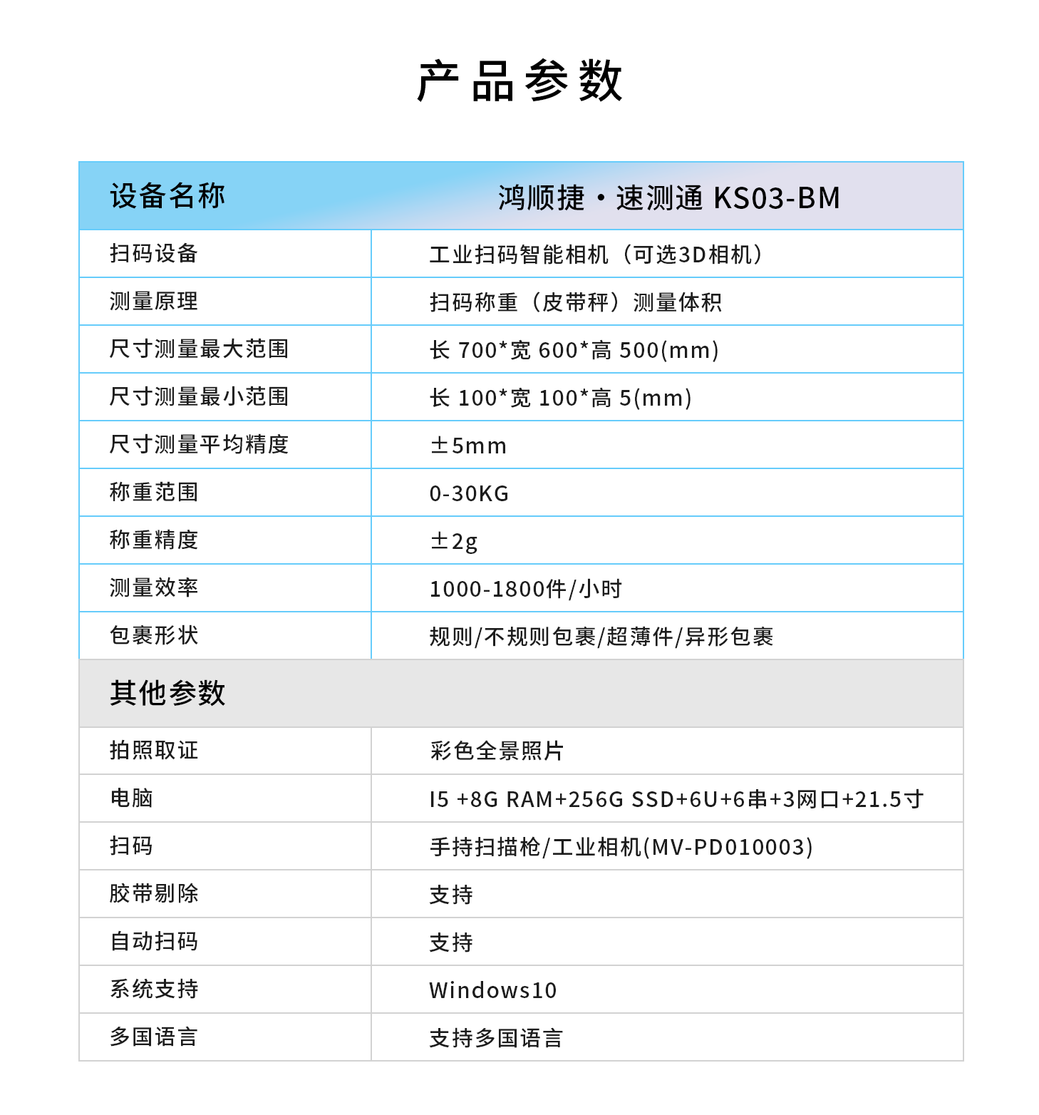 速测通KS03-M具备3D包裹体积检测功能,测量后数据可立即存储,数据可随时导出,精确到任何时间;适用于中小型产品的测量,规则/不规则,工作台可任意放置,可用于物流分拣与工厂制造流水线等场景。
