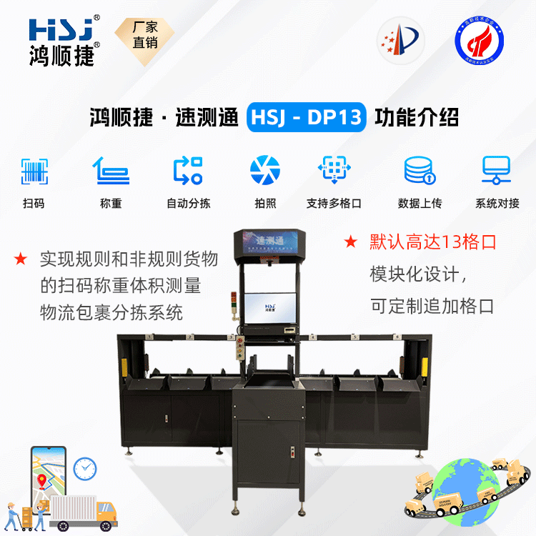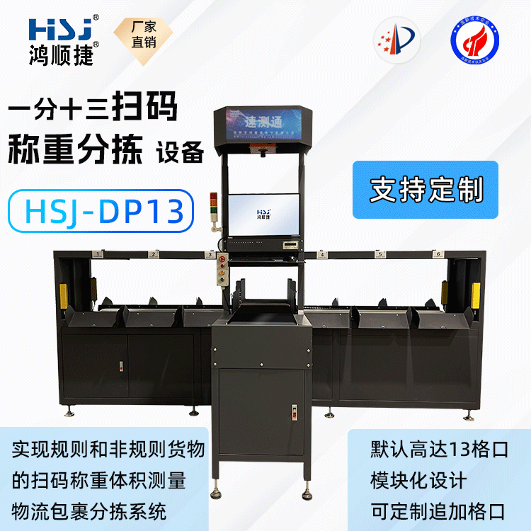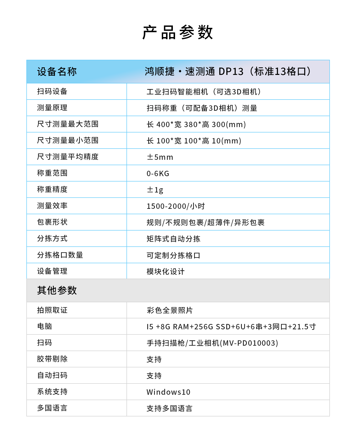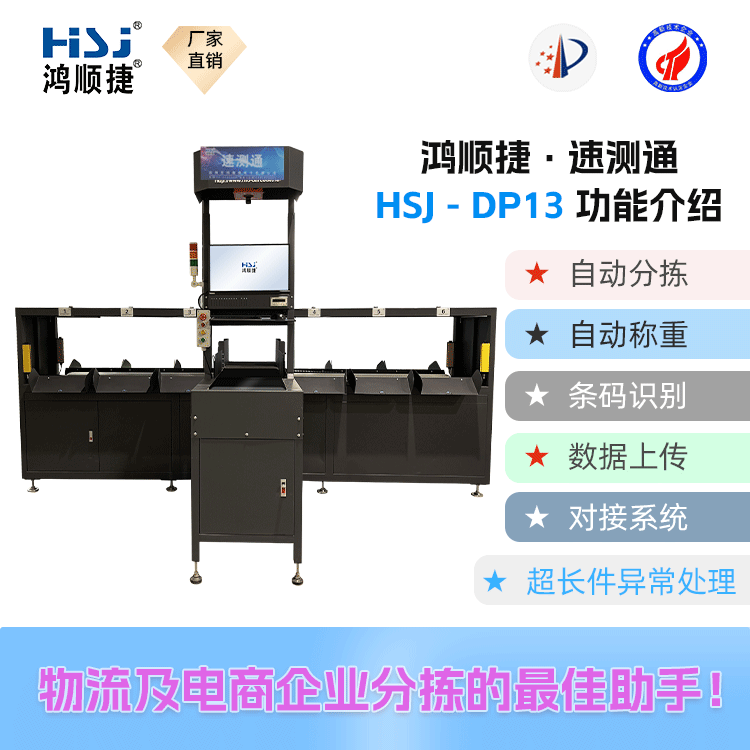 速测通DP13,一分十三速测通称重测量分拣系统,专为电商、物流、仓储行业提供的中小包裹扫码称重体积测量自动分拣设备,并且支持规则与非规则的包裹测量,测量称重精度±1g,在保证称重精度的状态下,采用皮带式快速分拣,接入流水线式工作,在称重扫码设备的原有基础上加了多个分拣口。扫码体积设备和分拣机的结合提高了快递行业的效率,降低了出错率,大大提高了工作效率,节约人工成本。测量效率可达每小时最少1500件包裹,稳定可靠,测量精准,支持测量数据信息上传到系统,是物流企业数据采集录入的最佳助手!