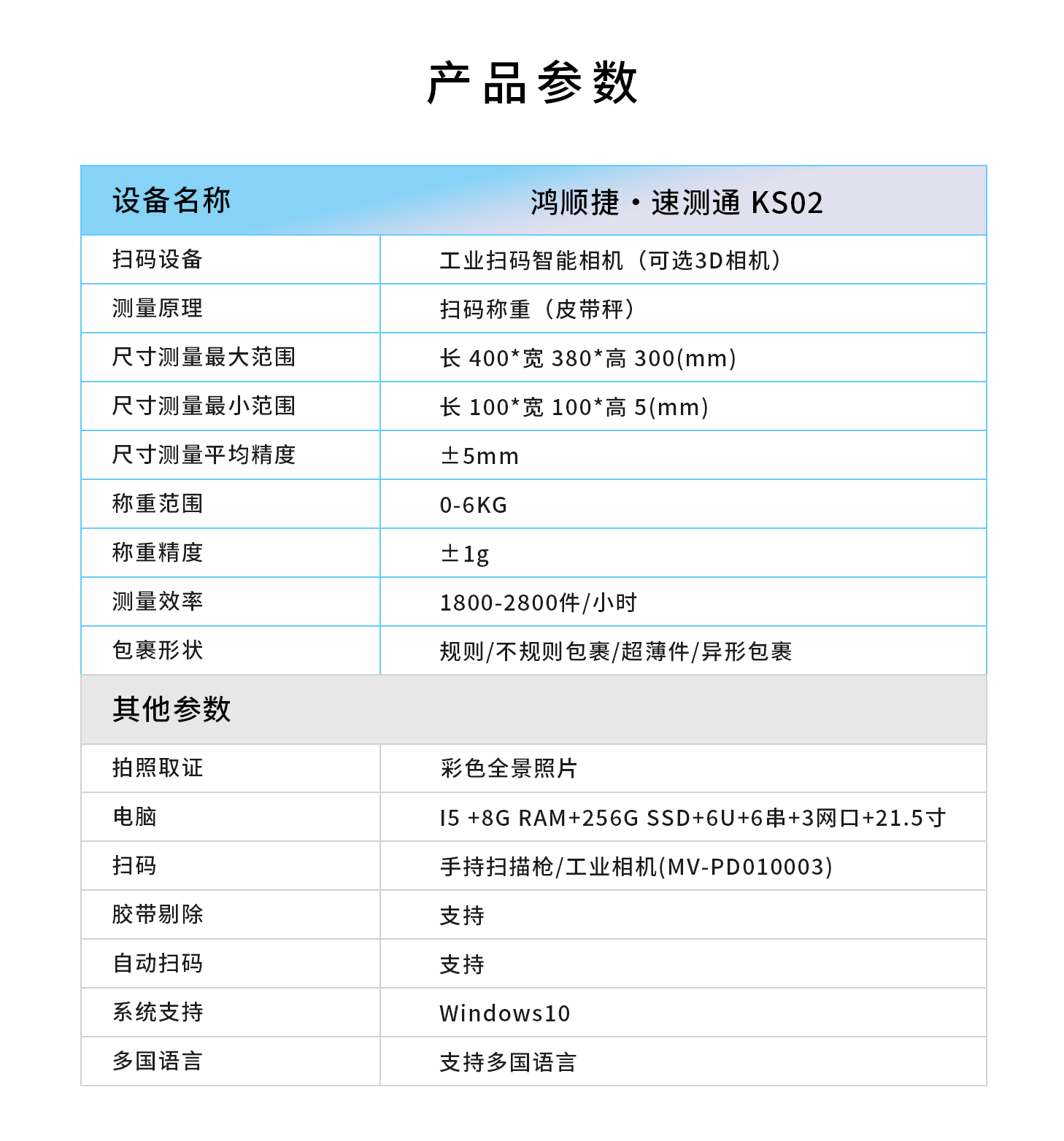 速测通KS-02动态扫码称重系统,专为电商、物流、仓储行业提供的中小包裹扫码称重设备,并且支持规则与非规则的包裹测量,测量称重精度在2kg内可达±1g,在保证称重精度的状态下,采用皮带式快速分拣,测量效率可达每小时最少1800件包裹,稳定可靠,测量精准,支持测量数据信息上传到系统,是物流企业数据采集录入的最佳助手!